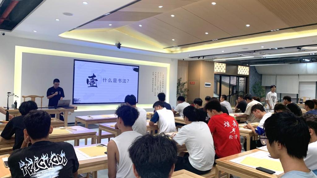 简单的开幕仪式后,翰阳书画协会会长盛春华为大家做了题为“学书法 蕴涵养”的书法基础知识讲座。接着,在讲座的实践环节,同学们踊跃参与,纷纷在协会工作人员的指导下书写毛笔字,感受中华优秀传统文化的独特魅力。
