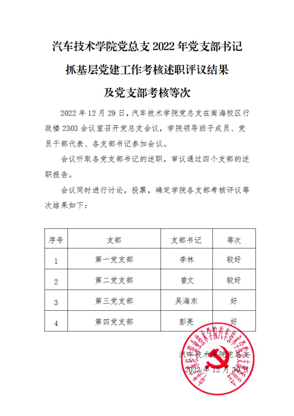 汽车技术学院党总支2022年党支部书记抓基层党建工作考核述职评议结果及党支部考核等次