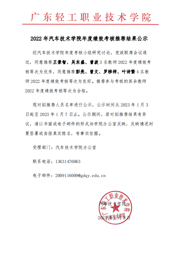 2022年汽车技术学院年度绩效考核推荐结果公示