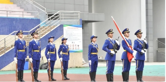 英姿飒爽的国旗护卫队迎着朝阳护送国旗进场,伴随着庄严的国歌奏响,五星红旗冉冉升起、迎风飘扬。