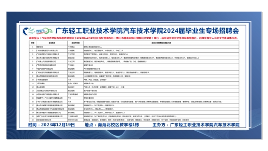 为做好2024届毕业生就业工作,搭建毕业生与用人单位的交流平台,拓宽就业渠道,2023年12月19日下午,广东轻工职业技术学院汽车技术学院在佛山南海校区1栋教学楼举办2024届毕业生专场招聘会。