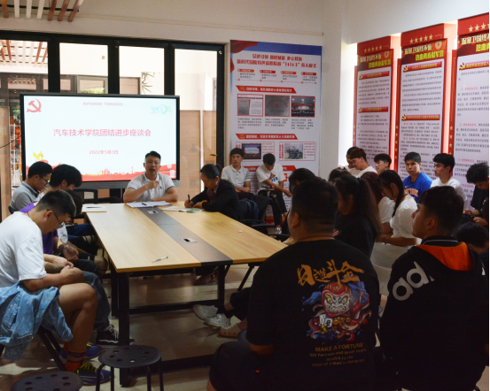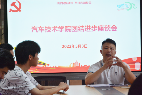 2022年5月3日下午,汽车技术学院党总支组织,在南海北区42栋国防教育馆召开了一次“团结进步”主题座谈会。本次座谈会邀请学生工作部副处长陈煜龙、学生工作部老师赵文卿出席,学院党总支书记何隽菁、副书记王福山、辅导员林育丹以及学院全体在校新疆籍同学参加了座谈会。
