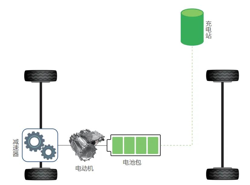 纯电动汽车(Battery Electric Vehicle,BEV)顾名思义就是只采用电力驱动的汽车,车辆的动力源是可充电的动力电池。相比于传统内燃机汽车而言,纯电动汽车取消了内燃机,其工作原理如图所示。